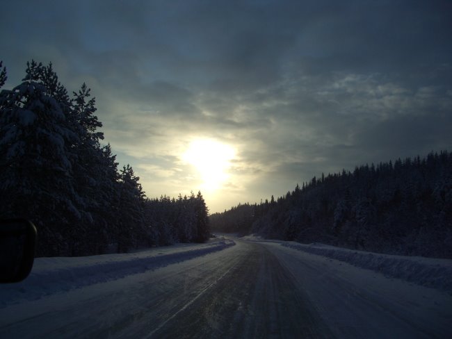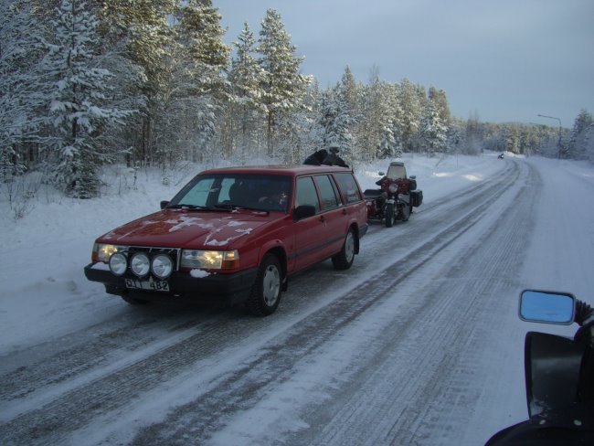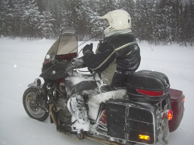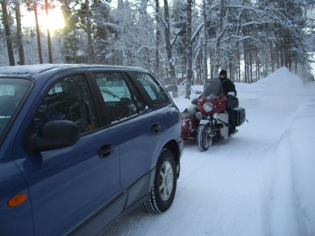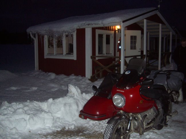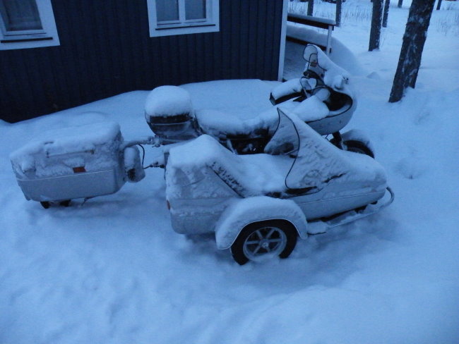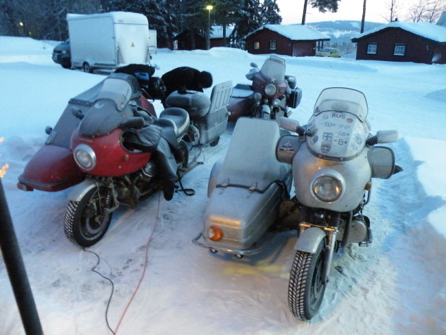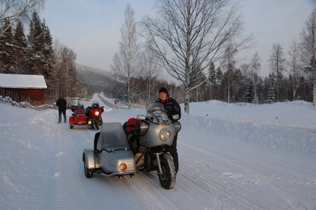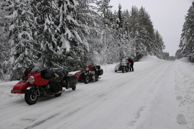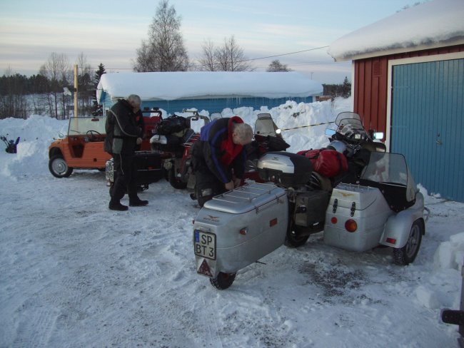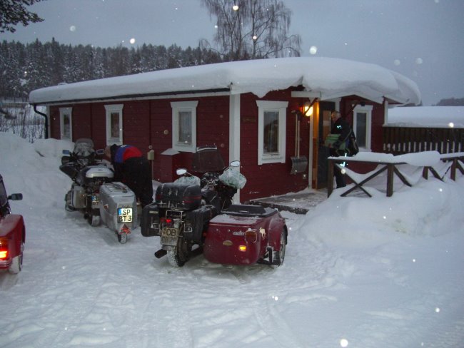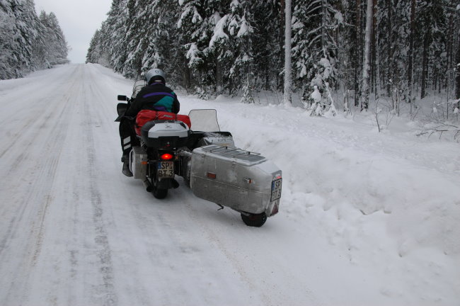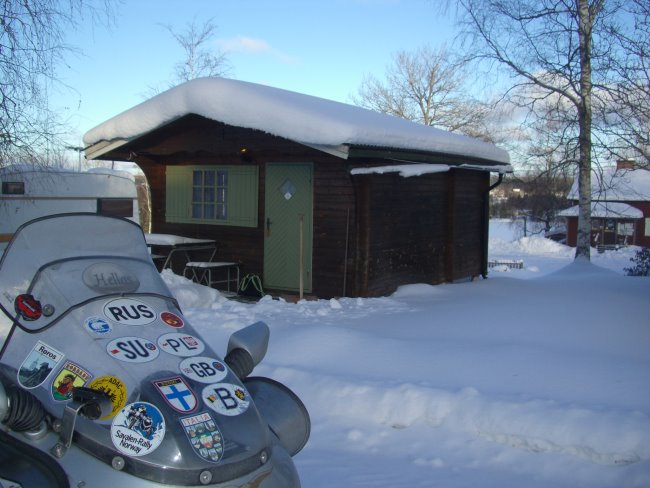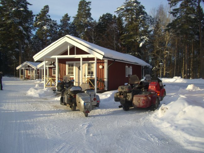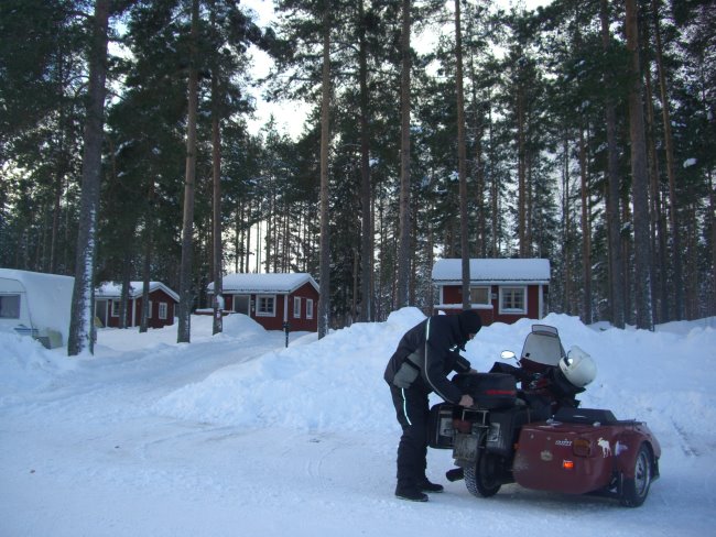 An diesem Tag stellte die extra für Holger installierte, am Seitenwagen angeschlossene Eberspächer-Standheizung ihren Dienst ein. Es war ein Elektrikproblem in der inneren Schaltung, das wir nicht mehr beheben konnten. Skutberget verließen wir am nächsten Morgen um 09:30h. Für ca. 50 km hatten wir leichten Schneefall, dann kam die Sonne durch und wir fuhren durch eine fantastische Winterlandschaft.