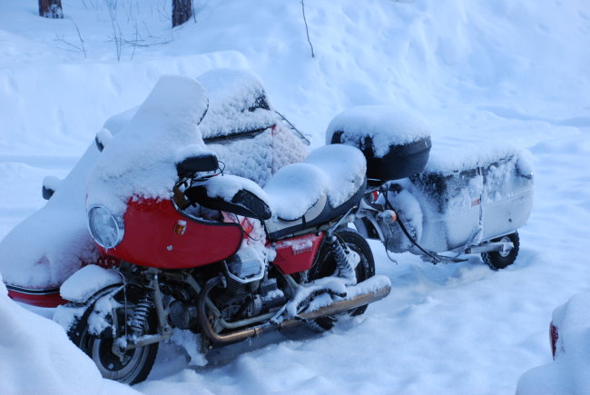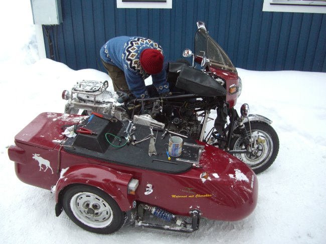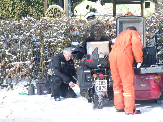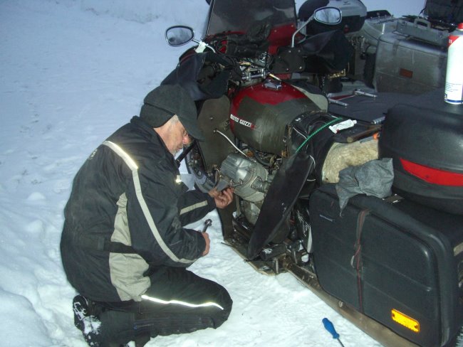 In der Nacht war die Temperatur auf -27 Grad gefallen. Gegen 09:00h starteten wir unsere Motoren. Die Guzzi’s sprangen nach 2-3 Kurbelwellenumdrehungen bei gezogener Kupplung problemlos an, was uns überraschte, aber auch erfreute. Plötzlich, nach ca. 2 – 3 Minuten quoll bei Thorstens Motor das Motoröl aus nur allen denkbaren Öffnungen und dann blieb der Motor stehen. Er ließ sich mit dem Anlasser auch nicht mehr drehen. Ein Schock, denn zunächst vermuteten wir einen kapitalen Motorschaden.