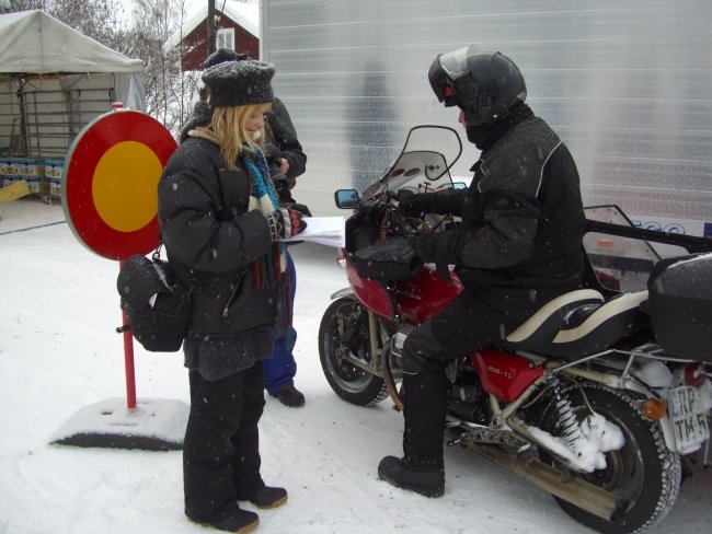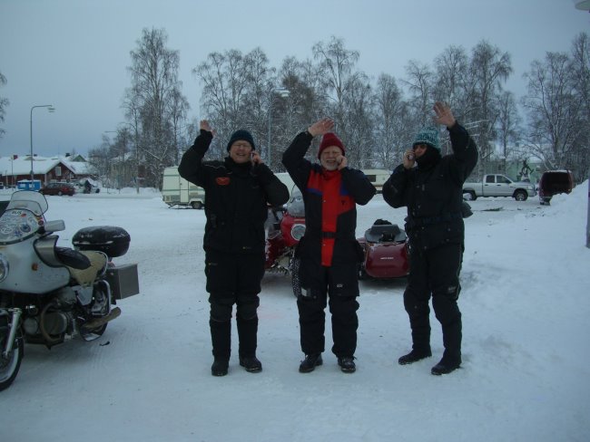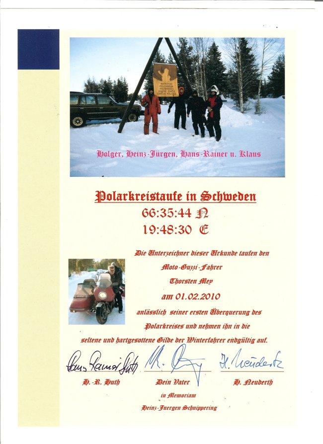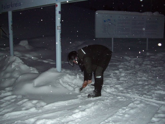 Später als geplant, aber nicht zu spät, um Thorsten einer Polarkreistaufe zu unterziehen. Er überschritt als einziger von uns zum ersten Mal den Polarkreis mit dem Motorrad im Winter. Die von uns ausgedachte Prozedur traf ihn völlig unerwartet. Zunächst drückten wir ihm einen Spaten in die Hand und er musste 20 Schaufeln Schnee von Süd nach Nord schippen.