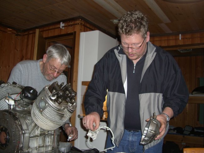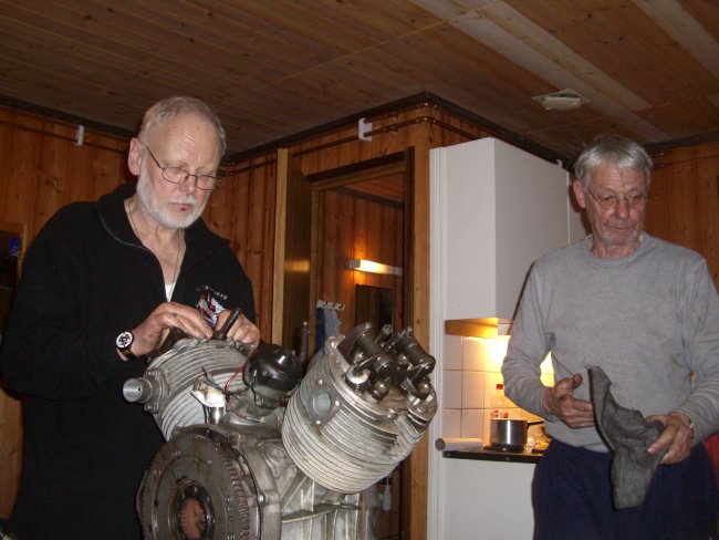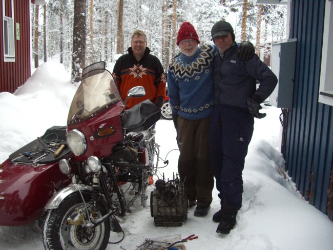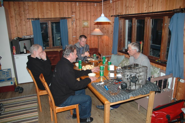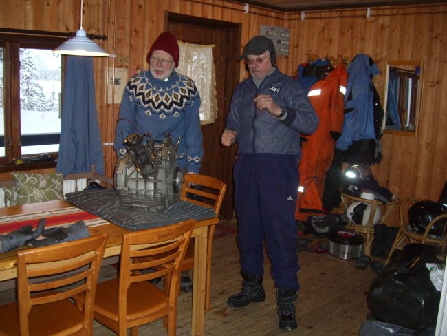 Zwischenzeitlich hatte Thorsten mit Nicklas Johansson telefoniert und unsere Situation geschildert. Spontan beschloss Nicklas, mit dem Auto nach Jokkmokk zu kommen, damit wir uns wenigstens sehen konnten. Die Demontage der Zylinder brachte uns leider nicht weiter. Wir vermuteten nun, das ein fest gegangenes Kurbelwellen-Hauptlager die Ursache des Defektes sein musste. So bleib uns nichts anderes übrig, als den Motor samt Getriebe auszubauen. Nach 3 Stunden hatten wir es geschafft und waren froh, dass wir uns erst einmal aufwärmen konnten.