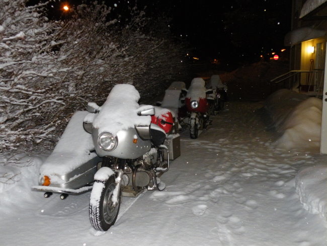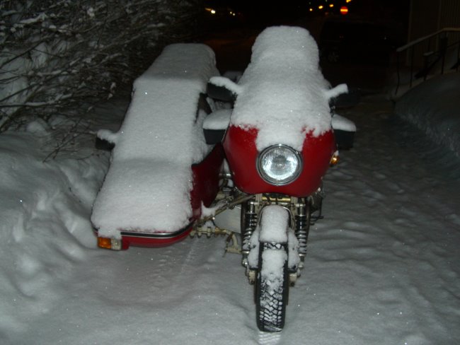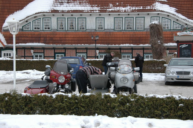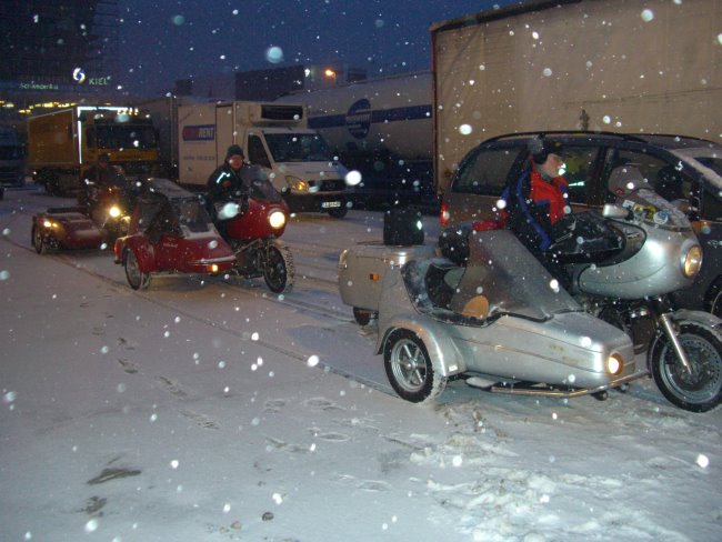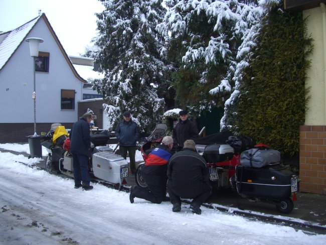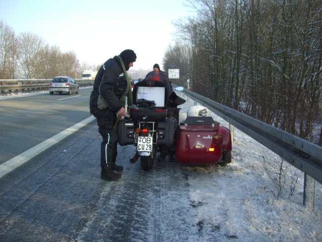 Nun, am 25.01.2010 war es endlich so weit! Thorsten und ich starteten bei starkem Schneefall in Speyer, aber auch bei viel Matsch und Salz auf den Straßen. Bereits nach rund 25 km, kurz vor Frankenthal rollte Thorsten mit seinem Gespann auf dem Seitenstreifen aus. Nichts ging mehr, der Motor seines Gespannes war nicht mehr ans Laufen zu bringen. Das fing ja schon gut an!