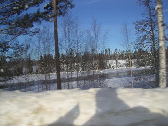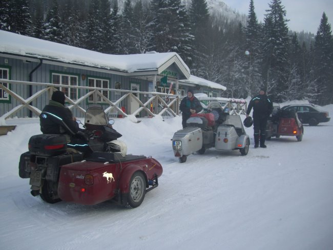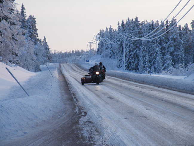 Gegen 14:30h setzten wir unsere Fahrt Richtung Frösön fort. Bis dorthin hatten wir 278 km vor uns. Es war immer noch -20 Grad kalt. Das machte sich trotz Thermoboy und Funktionswäsche unangenehm bemerkbar. Insbesondere Holger litt im Seitenwagen unter kalten Füssen, und das trotz dicker Socken und Moonboots. Die Landschaft, durch die wir fuhren war beeindruckend. Tiefer Schnee, viel Sonnenschein und nicht gestreute, schneebedeckte Straßen, auf denen wir unsere Gespanne richtig laufen lassen konnten.