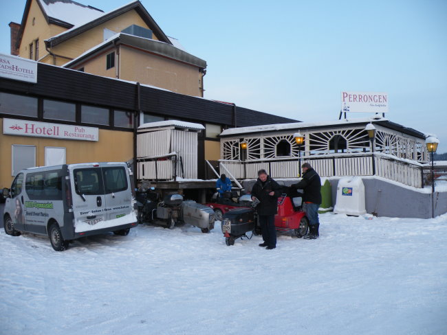 Der Platzbetreiber war sich nicht mehr sicher, ob wir wirklich kommen würden. Er konnte sich einfach nicht vorstellen, dass man solch eine Reise, wie wir sie hinter uns hatten, im tiefsten Winter machen würde. Zumal es in Schweden der kälteste Winter seit mehr als 20 Jahren war. Am Abend ließen wir uns von einem Taxi in das Zentrum fahren, um ihn bei einem guten Essen in einem schönen Lokal ausklingen zu lassen. Wir bedauerten, dass keiner von uns einen Photoapparat mitgenommen hatte, denn Lidköpping bei Nacht bietet im Zentrum eine Menge schöner Motive.