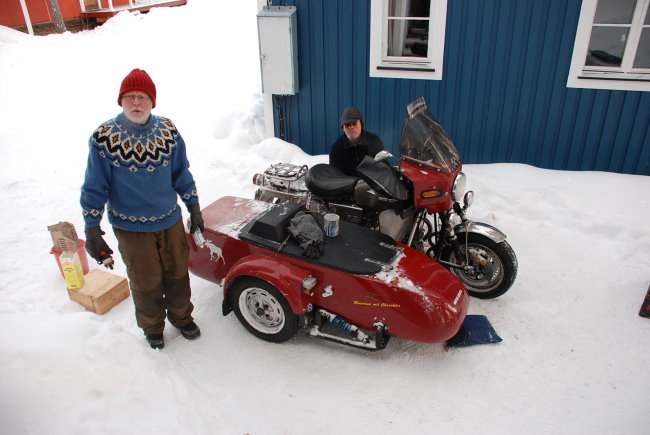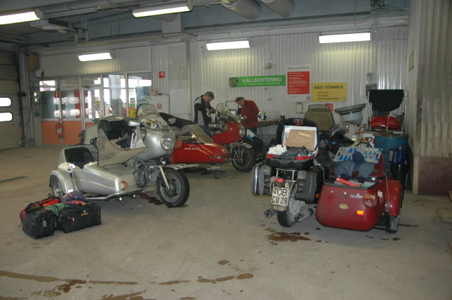 Nun brauchten wir eine Werkstatt oder irgendeinen Raum, wo wir der Sache auf den Grund gehen konnten, denn bei -27 Grad im Freien sind Reparaturen nicht gerade angenehm. Also fuhr ich mit Thorsten durch Orsa, um solch eine Räumlichkeit zu suchen. An einer Tankstelle trafen wir zwei junge Leute, die uns vorher bereits am Hotel gesehen hatten. Nachdem wir ihnen erklärt hatten, was unser Problem war, fingen sie an zu telefonieren. Nach ein paar Minuten sagten Sie uns, wir sollen ihnen folgen. An einer großen Tankstelle hielten sie an, zeigten auf eine große Halle und sagten, dass wir dort die Reparatur durchführen könnten. Die Tankstellenpächterin stellte den Raum ohne Berechnung zur Verfügung. Es war eine Werkstatt für Selbstschrauber. Ihre Aussage war, dass sie von Motorradfahrern, die im Winter durch Schweden reisen, nichts nimmt! Wir waren froh, dass wir in einer beheizten Halle arbeiten konnten.