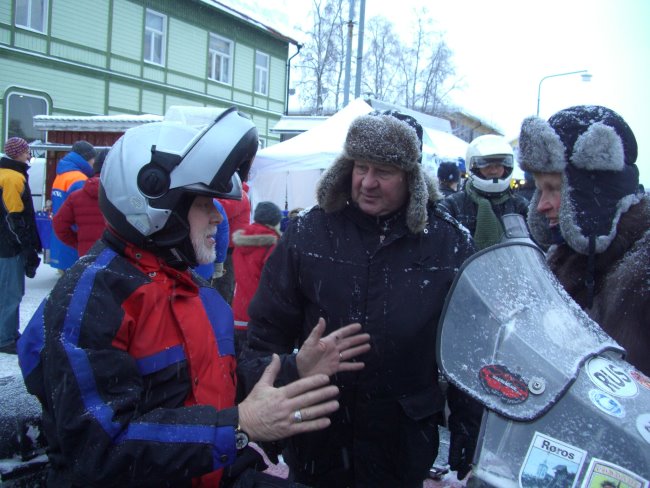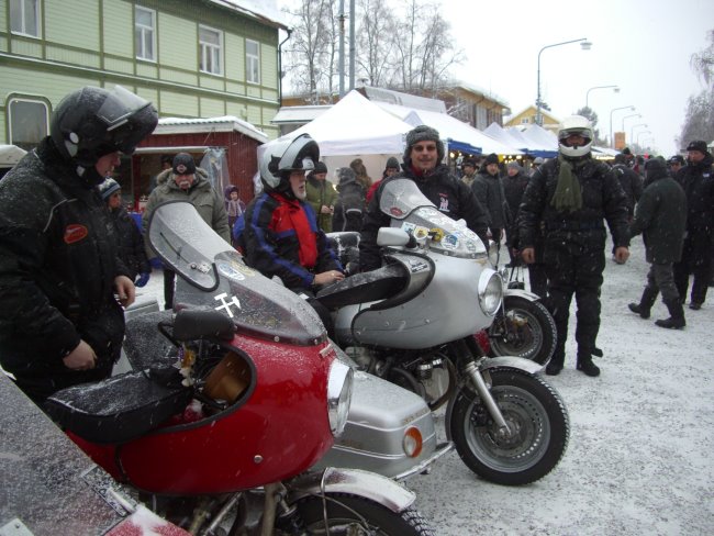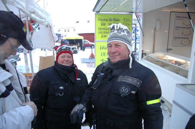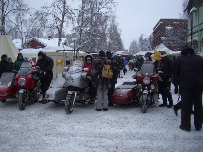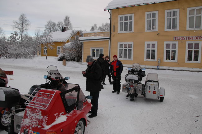 Er schloss am Abend, wobei ein Teil der Marktbeschicker auch auf dem sich anschließenden Wintermarkt, der bis zum Wochenende ging, vertreten war. Zwischenzeitlich war der gesamte innere Bereich von Jokkmokk für den Verkehr gesperrt. Da wir auf jeden Fall ein paar Photos mit unseren Gespannen auf dem Markt machen wollten, fragten wir beim zuständigen Beamten des Ordnungsamtes nach, ob wir eine Genehmigung für das Befahren des Marktes erhalten könnten. Zunächst lehnte er diesen Wunsch ab. Aber als wir ihm erklärten, dass wir über 2.000 km mit dem Motorrad zurückgelegt hatten, um solche Photos zu machen, hatte er ein einsehen. Wir verabredeten uns für den nächsten Tag um 14:00 h an einer Zufahrt zum Marktgelände. Wieder lag die Temperatur bei -26 Grad!!