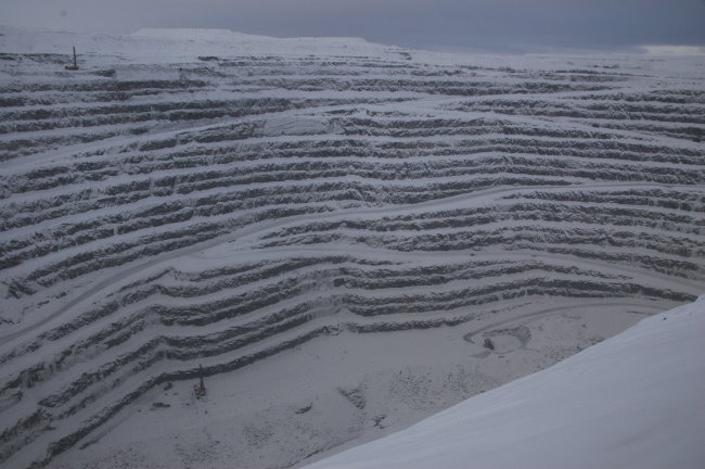 Wie versprochen, hatte Nicklas eine Besichtigung der Aitik-Mine für uns organisiert. Es ist die am nördlichsten gelegene Kupfermine Europas. Hier wird im Tagebau Kupfererz abgebaut, als Nebenprodukte werden auch noch Silber und Gold gewonnen. Es ist eine gigantische Anlage, deren Ausmaße kaum vorstellbar sind. Zurzeit liegt die Sohle der Mine bei einer Tiefe von 450 m, der Ausbau ist bis 600m vorgesehen.