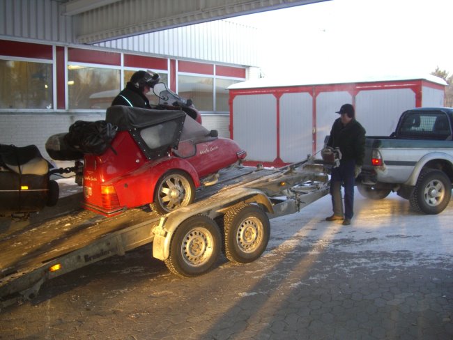 Nun musste Thorstens Gespann noch dorthin geschleppt werden. Auf unserem Hotelparkplatz stand ein Geländewagen mit großem Fahrzeug-Trailer. Kurzerhand sprach ich den Fahrer an, ob er das Gespann zur Werkstatt transportieren könne. Ohne langes Zögern war er dazu bereit. Das Gespann samt Anhänger wurde auf den Trailer gezogen, Thorsten bleib auf seinem Motorrad mit fest angezogenen Bremsen sitzen -da durch sparten wir das verzurren- und ab ging es zur Werkstatt.