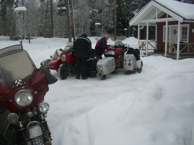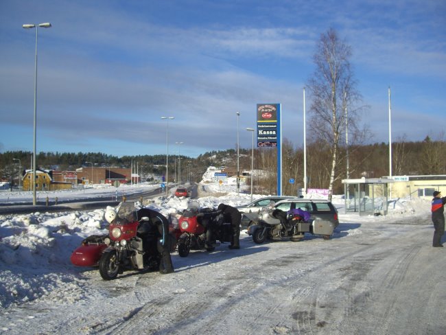 Vor uns lagen rund 265 km. Göteborg empfing uns mit schönem Wetter. Die Temperatur lag bei -5 Grad, es lag nur wenig Schnee. Das änderte sich nach rund 100 km. Wir fuhren in den ersehnten Winter. Nach der Hälfte der Strecke legten wir eine Rast ein, da die Zündeinstellung an Rainers Motorrad korrigiert werden musste.