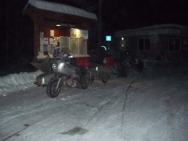 Zwischenzeitlich war die Dämmerung hereingebrochen und wir fuhren in die Nacht hinein. Das war anstrengend, denn durch den vielen Schnee war nicht sichtbar, wo die Straßengräben verlaufen, volle Konzentration war erforderlich. Hilfreich waren in dieser Situation unsere Navigationsgeräte. Auf dem Display konnten wir wenigstens den groben Straßenverlauf erkennen. Nach einer weiteren Stunde Fahrzeit machte Rainers Zündung erneut Probleme. Wir fuhren einen kleinen Parkplatz an, der lediglich im Bereich einer Info-Wand etwas beleuchtet war.