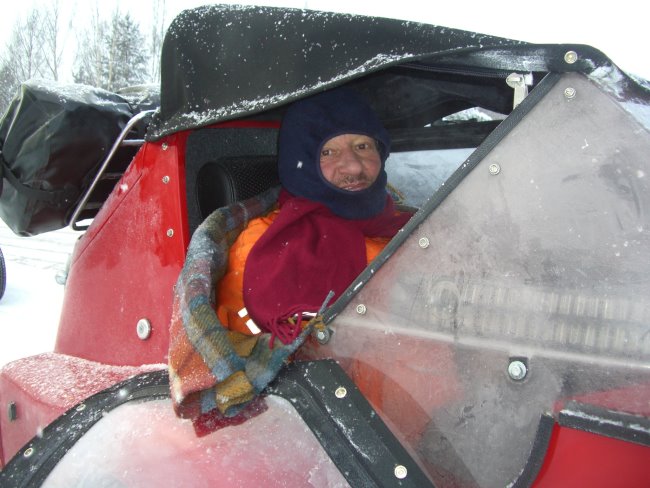 Die Temperatur war zwischenzeitlich auf -25 Grad gefallen. Bis zu unserem vorgesehenen Etappenziel hatten wir immer noch knapp 200 km vor uns, die an diesem Tag nicht mehr zu schaffen waren. Durch das lange Warten an der Unfallstelle und der nachfolgenden Reparatur waren wir alle ziemlich unterkühlt. Holger hatte sich aufgrund der Kälte unter das Seitenwagendach verzogen.