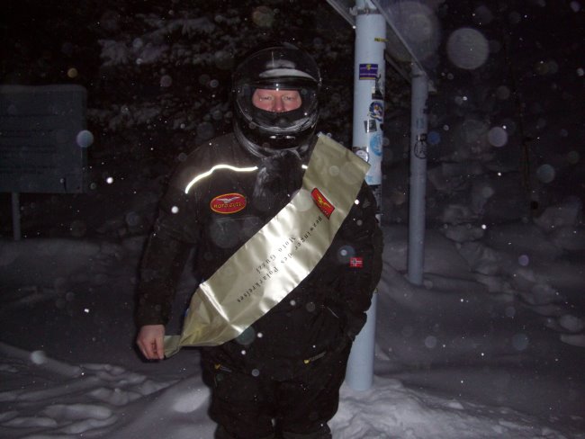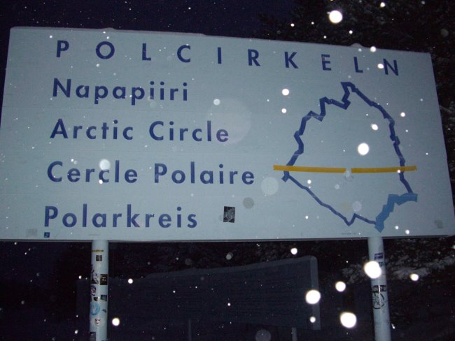 Thorsten hatte an diesem Tag ebenfalls Probleme mit seinem Schuberth-Heizvisier. Scheinbar war ein Anschlusskabel nicht mehr in Ordnung. So war auch er -wie Rainer am Vortag- gezwungen, mit offenem Visier zu fahren, was die Sache nicht gerade erleichtert hat. Gegen 16:30h, es war schon dunkle Nacht, erreichten wir ca. 6 km vor Jokkmokk den Polarkreis.