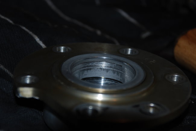 Nachdem wir mit den Winkelschraubenziehern nichts mehr ausrichten konnten, trieben wir an zwei gegenüberliegenden Seiten Karosseriescheiben zwischen Flansch und Gehäuse und zwar so lange, bis endlich M8-Muttern in den Spalt passten. Nun konnten wir zwei M8-Schrauben in das Gehäuse einschrauben und durch drehen der Muttern das Lager herausdrücken.